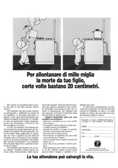 “Molti degli incidenti di cui sono vittime i bambini nascono dalla distrazione degli adulti, che non riflettono sul fatto che oggetti o prodotti di uso comune possono essere una minaccia alla vita dei piccoli, se lasciati alla loro portata. La campagna sollecita l’attenzione dei genitori al tema e promuove una maggior consapevolezza delle incredibili cose che un bambino può fare con molti degli oggetti da cui è circondato. Spedendo il coupon presente sull’annuncio, Pubblicità Progresso invia gratuitamente un opuscolo in cui sono illustrati i pericoli che può correre in casa un bambino e il modo per evitarli: si tratta di un chiaro, semplice ma completo articolo di cui la rivista Selezione del Reader’s Digest ha concesso l’uso, curandone anche la stampa e l’invio. L’opuscolo è stato inoltre ristampato a cura delle Casse Rurali e Artigiane della provincia di Bergamo, che ne hanno provveduto alla diffusione presso i ragazzi delle scuole elementari e medie”